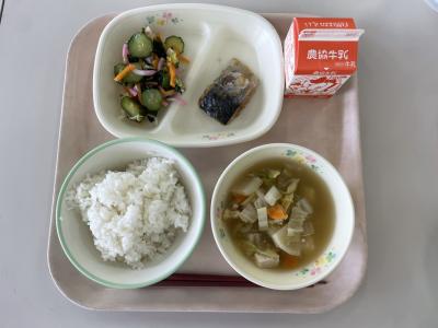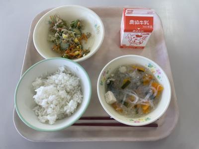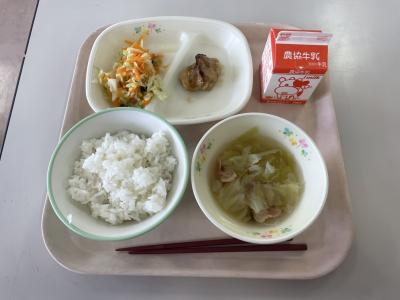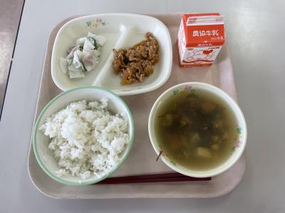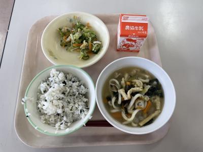 今日の給食は、わかめごはん、キャベツとちくわの梅和え、五目うどんでした。