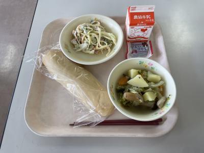 2025年6月13日 17時39分6/12の給食は、コッペパン、スパゲッティサラダ、野菜たっぷりポトフでした。