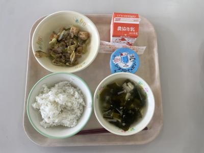 2025年5月29日 13時17分今日の給食は、ホイコーロー、とろみわかめスープ、ソーダフロート風ゼリーでした。