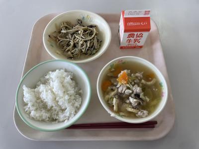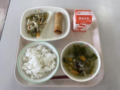 今日の給食は、春巻き、茎わかめ中華炒め、チンゲン菜の中華スープでした。