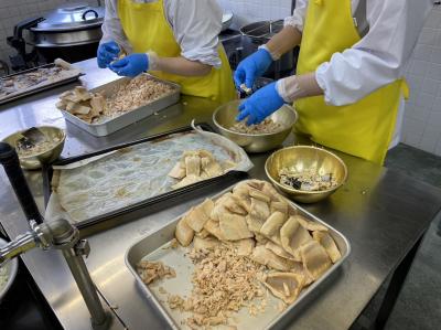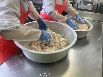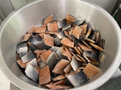 スチコンで加熱したものを、手作業で骨を取り除きながらほぐしていきます。