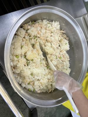 調味料で味をつけたごはんに、ほぐしたさくらます、枝豆を混ぜ込んで完成です。