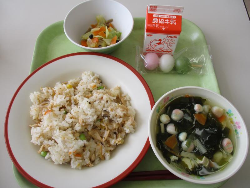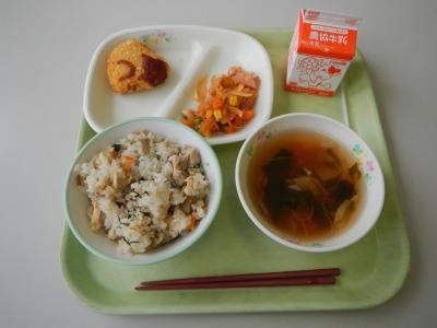 炊き込みごはんは、児童に人気の献立です。ご飯茶碗にいつもより多くよそわれていました。