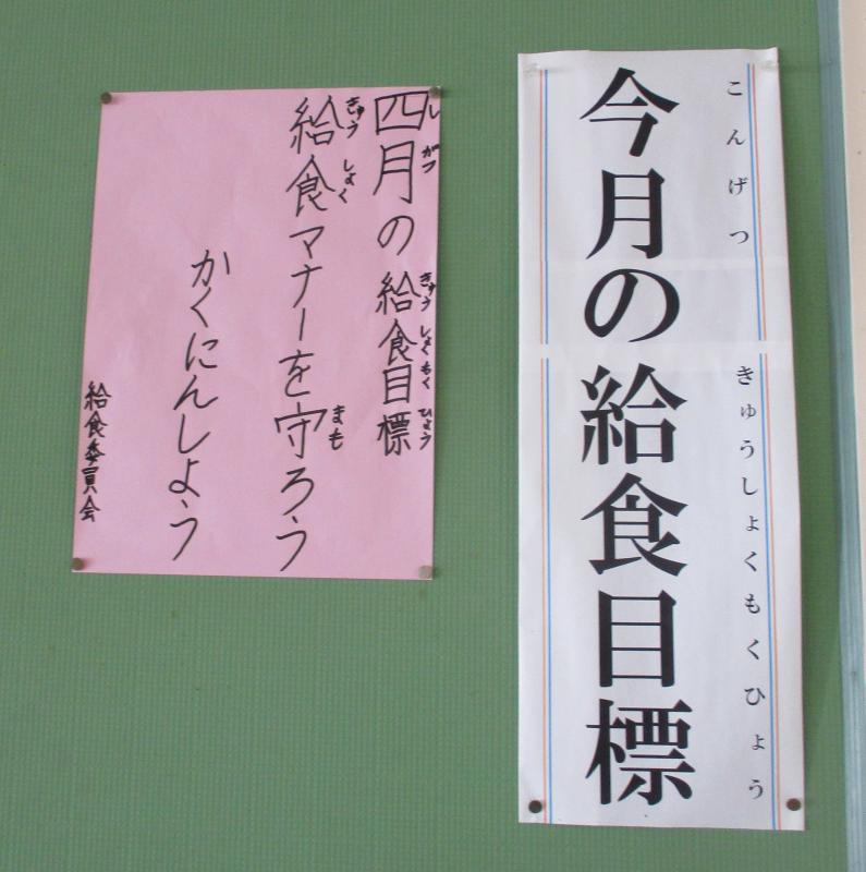 新年度になり、1年生が入学してきたので、給食のマナーを改めて確認して守ろうということで、この目標になりました。