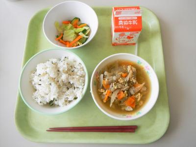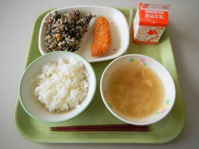 飯田共同調理場のわかめごはんは、わかめ、ごま、シラスがたっぷり入っています。