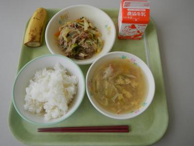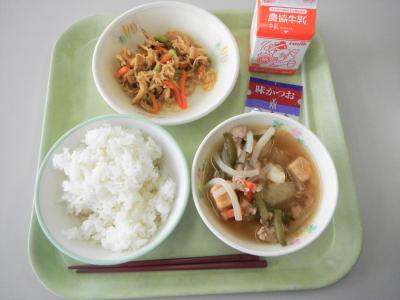 給食では野菜をたくさんいれ、お肉に醤油ベースの味付けをしました。