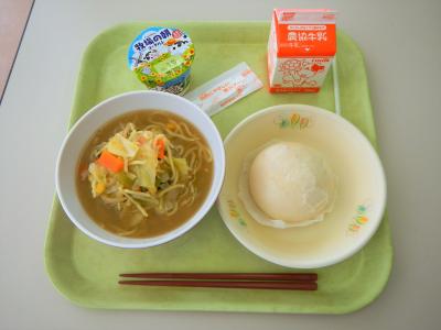 今日の給食はリクエストメニューの「しょうゆラーメン」でした。