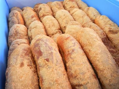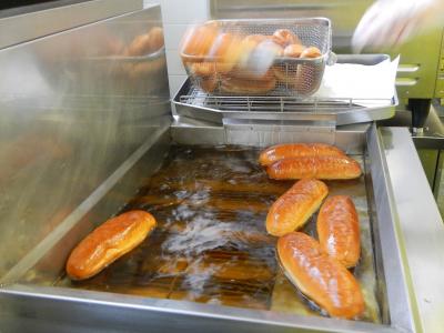 一つ一つ調理場で揚げて、きな粉を付けています。