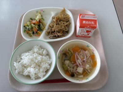 今日の給食は、豚肉とれんこんのピリ辛炒めでした。
