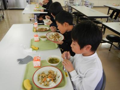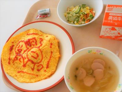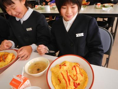 今日の給食は飯田小学校のリクエスト給食で、「オムライス」でした。