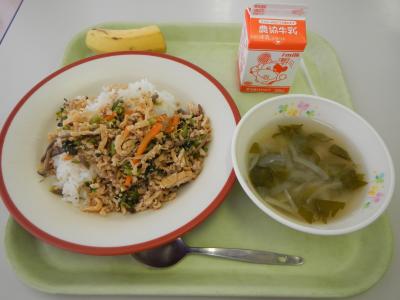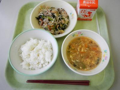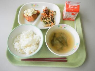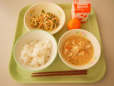 今日の給食は鶏肉、豚肉、卵、野菜と、幅広い栄養素が取れます。