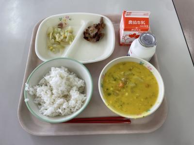 今日の給食は、もーもースクールに合わせて、牛乳を使ったかぼちゃのシチューでした。