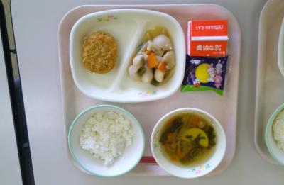 今日の給食は、鶏肉と野菜の焼きつくねでした。
