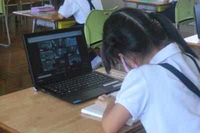 画面の向こうの教師の指示や発問に、ノートに書いたり手を挙げて答えたりしていました。