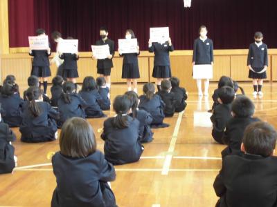 全校朝会で、保健委員会が発表しました。