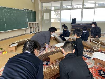 1月26日(木)に4年生は、音楽の学習で箏体験をしました。町の先生の濱塚さんに来校いただき、箏の仕組みや奏法をていねいにご指導していただきました。濱塚さんありがとうございました。