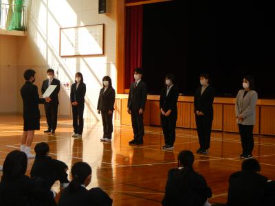 離任式では、卒業生も来校し、3月末で異動する教職員とお別れをしました。今まで飯田小学校のためにありがとうございました。
