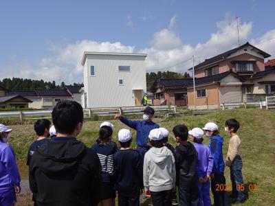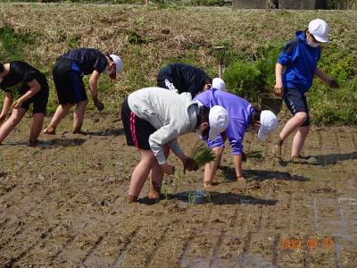 5月2日(月)5年生の田植え体験がありました。飯田町唯一の田んぼで地域の方のお力をお借りして田植え体験を行いました。はじめは、おっかなびっくりの5年生たちでしたが、そのうち、田んぼの感触にも慣れ、上手に苗を植えることができました。地域の皆さん、教えていただきありがとうございました。ご飯を食べるにも大きなご苦労があることがわかった5年生でした。