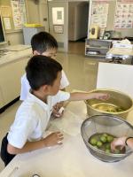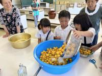 そして、採った梅の実は、青梅はジュースに、熟した梅は梅干しにすることにしました、飯田小の先生たちも、お若いですが、梅ジュースづくりはお手の物です。ただし、梅干しづくりは、避難所の皆さんにお聞きしてつくることとしました。おいしいものができるといいですね。