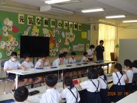一つは、6年生が中心の夏休み前の児童総会と郊外子供会を行いました。夏休みの生活や決まりごとについて6年生から説明があり、下級生からの鋭い質問に、てきあきと切り返す6年生の姿が素敵でしたね。あわせて、郊外子供会では、ラジオ体操の確認や安全に生活するためのチェックなどを行いました。夏休みが楽しみで仕方がない様子でしたね。
