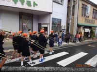 歓送は、5年生から3年生までの鼓笛隊演奏に続き、6年生からの「木遣り歌」と曳山の巡行が披露されました。子どもだけでなく大人も一緒に木遣り歌を歌い、引っ張り、今年最後の飯田っ子とろ山祭りが開かれました。卒業生の皆さん、中学校でも、元気に仲間の輪を広げて活躍してください。
