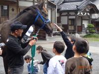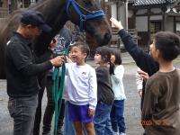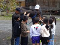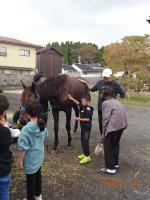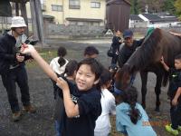 10月23日(金)2年生は、飯田町の乗光寺で、競走馬を引退した馬とふれあいました。この日は、珠洲にある「みんなの馬」さんの活動を紹介するビデオ撮影があり、2年生が呼んでいただいたのです。馬の大きさにびっくりしたり、優しくなでてあげたり、餌をあげようと熱心に草を探して食べさせてくれたりした2年生でした。好奇心旺盛な2年生が、馬と仲良くなるのは、すぐでした。馬にも、2年生の優しさが伝わったら、嬉しいです。