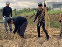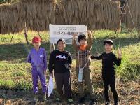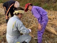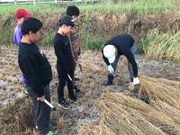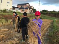 9月2日(土)の早朝に、5年生が稲刈り体験をしました。5月に田植え体験させていただき、今度は実った稲穂を刈り取りました。きた会さんのお世話で、鎌を使って刈り取り、わらで二束を縛り、はざかけをしました。刈り取るだけでなく、縛って束にするのも四苦八苦しましたが、そのうちに何とか恰好がつくようになった5年生と職員でした。お米を食べるまでに、大変なお世話があるのだなあ、と改めて知ることができました。今日のご飯はいつも以上に甘く感じるのではないでしょうか。