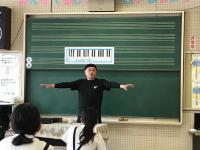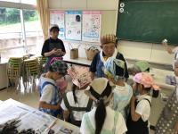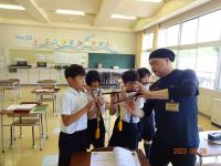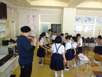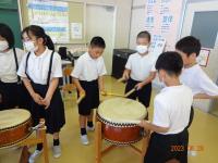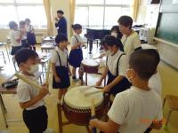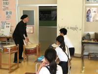 初めは遠慮がちだった児童も、太鼓のばちをもったり、笛を借りたりするうちに、祇園ばやしのリズムや音色にはまり込んでいきました。校舎内に一月早いお祭りの、軽快な音色とリズムが溢れ、うきうきする気持ちが漂っていました。4年生も、松浦さんの笛と一緒に演奏を楽しむうちに、祭りを楽しみに待つ気持ちや、町の仲間を愛する気持ちが自然と湧いてきているように感じました。町の伝統音楽の魅力に気づいた一日でした。