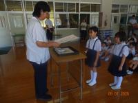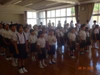 始業式会場に入る際には、どの学年も大きな声で挨拶していました。また、初めて伴奏を担当する二人を迎えて、全校児童が大きな声で校歌を斉唱しました。声も心もそろって、大変気持ちの良い校歌斉唱で、2学期の活躍が楽しみになりました。併せて、相撲大会で出場し、活躍した児童達による納賞がありました。