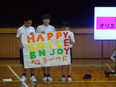 6年生から今年の運動会のテーマ発表がありました。「HAPPY SMILE ENJOY 心を一つに」です。とにかく笑顔、子どもも地域のみなさんも楽しんで幸せを感じられるように、心を一つにして運動会を作りましょう、と発表してくれました。6年生の思いが伝わってくる素敵なテーマです。