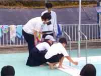 今日は、体育実技の指導者として、盤戸大樹さんに来校していただき、指導していただきました。今年初めてのプール学習でしたが、どの児童も水を怖がらず、順調に水になれることから始めていました。