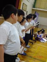 卒業を祝う会・感謝する会が終わり、5年生から6年生へ1人ずつ感謝のメッセージを伝えました。1年間を振り返り、様々な行事を通して、6年生の偉大さを実感した5年生。今までの感謝の気持ちと、これからの決意を6年生に伝えました。