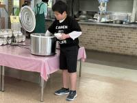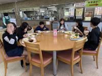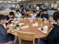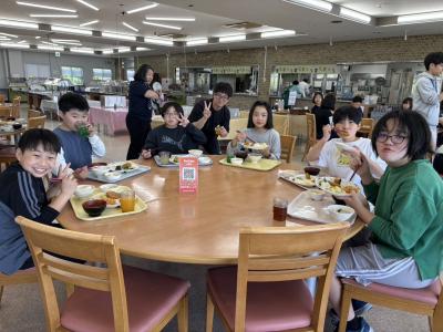 5月1日(木)午後。ディスクゴルフも盛り上がり、今は昼食タイムです。どうぞ、この満足そうな表情を見てください。ブッフェスタイなので、自分に合わせて量や内容が決められるようです。早起きして元気に活動した分、おなかはぺこぺこでしょう。いつもの給食と違う食堂や雰囲気に、にこにこの笑顔が光っています。