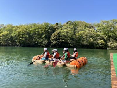 こちらの心配をよそに、みんな真剣な顔で製作し、無事にどのいかだも池の上に浮かびました。そして、誰も落ちなかったそうです。すばらしいですね。さすが、飯田っ子5,6年生。みんな元気です。