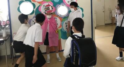 朝の児童玄関に、あいさつマンが登場しました。これは、友達同士明るいあいさつを交わして、一日仲良く元気で過ごそうと考えた取組です。あいさつマンのあいさつにみんなもいつも以上に明るいあいさつを返していました。自然とみんなの顔も笑顔です。あいさつマン、そして全校児童の皆さん、ありがとう。