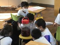 1学期につくった梅干しの表面にかびが生えていて、なぜそうなるのか、勉強しました。目には見えないけど、空気中にも菌はいること、自分たちの手にも菌はくっついていること、丁寧に手を洗えば清潔に保てることを学びました。梅干しのかびから、自分たちの健康を守る習慣について学ぶ時間となりました。