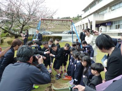 入学式後は、教室で担任の先生のお話を聞きました。その後は、校庭へ出て、桜の苗木を植樹しました。北國新聞社さんの支援と、日本さくらの会さんの協力で、苗木をいただきました。能登の一年生に元気に育ってほしいという思いをいただきました。4年生の先輩がお手伝いをして、一年生と一緒に気持ちをあらたにもっていました。元気に大きく育て、飯田っ子。