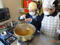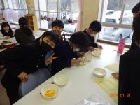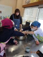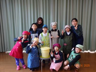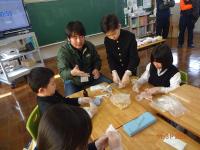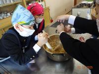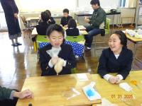 2月14日(金)3年生は、飯田公民館へ出かけ、公民館主事の清水さんから「味噌づくり」を教わりました。大豆から味噌ができることは、国語の「すがたをかえる大豆」の勉強で知ったのですが、本当に作れるのか、興味津々で祖損だ3年生でした。煮た大豆をすくう、つぶす、糀と塩と混ぜる、こねる、味噌玉つくる、樽につめる、どの工程も積極的にでも譲り合い、効率よく考えて体験しました。どの子の顔も目が見開いて、全部吸収しようと一所懸命です。終わった後も、進んで洗ったり、掃除したりできました。最後には、一人ずつ感想を述べ、お礼のあいさつをして体験を終えました。「意外に簡単だった」「初めてで楽しかった」という感想と、みんなの一所懸命な様子に、主事さんも嬉しそうでしたね。