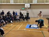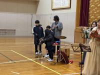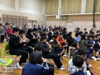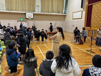 バイオリンの心揺さぶる音色と、パーカッションの心沸き立つリズムに引き付けられた児童達でした。一部合同演奏したり、最後の「情熱大陸」はみんなで立ち上がってリズムに乗って楽しみました。外は寒い一日でしたが、みんなで音楽を楽しめて、身も心もあったまった時間でした。