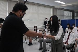 今年の夏休みに行われたアステナホールディングスインターンシップに参加した5グループ13名の生徒に対して、岩城社長様から直接に1グループ10万円の奨学金目録が授与されました。卒業時に進学等の費用として役立てるために贈られることを約束するものです。生徒を代表して、3年B組の浦純華さんが貴重な経験を与えてくださったことに対して謝辞を述べました。