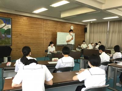 7月26日(月)に、緑丘中学校3年生・宝立小中学校9年生を対象に、各中学・小中学校を卒業した本校生徒が講師を務める進路講演会が開かれました。どちらの学校も、生徒間の対話を重視した形で行われました。