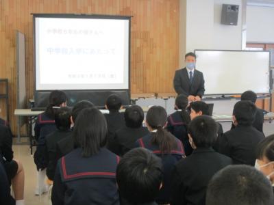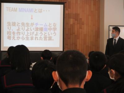 1月15日(金)に津幡南中学校から上野先生にお越しいただき、中学校に入学し、TEAM MINAMIの一員としてこれからどんな中学校生活が待っているのか、そして中学校に向けてこれからどんな生活を送ってほしいのかお話をしていただきました。