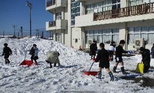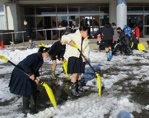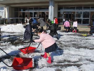 20日は凍った雪をスコップで割ったり,運べる雪をスノーダンプで雪山に持っていったりしました。子供たちが踏んでくれたこともあり,どんどん解け始めました。