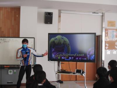 児童にはなじみの薄い競輪について、レースの映像を交えて分かりやすくお話しくださいました。競輪だけでなく、どの職業においても「プロ」とは何なのかということを教えてくださいました。また、夢や目標に向かって強い意志をもつこと、そして続けてやり遂げること等、これから中学校に向かう6年生にとって有意義なお話でした。