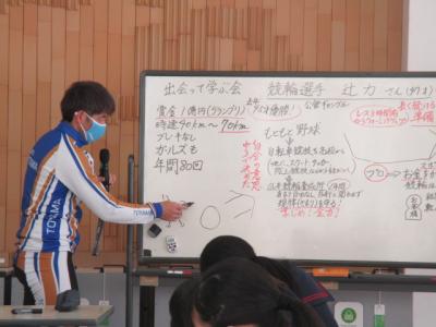 1月21日、6年生の総合的学習の時間「出会って学ぶ会」第3回は地域にお住いの競輪選手、辻力さんにお越しいただきました。