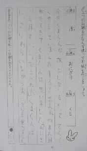 今日の3年生は,「3題ばなし」という作文でした。「月」「おにぎり」「くま」の3つの言葉からお話を作り書いていました。1文だけではなく幾つかの文にしたり会話「 」を入れたりしている子もいました。