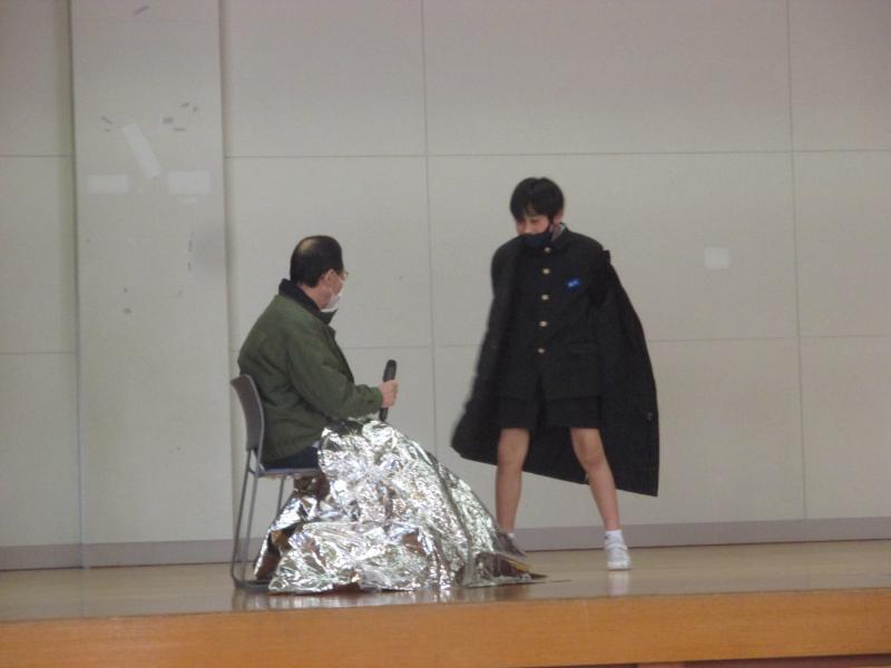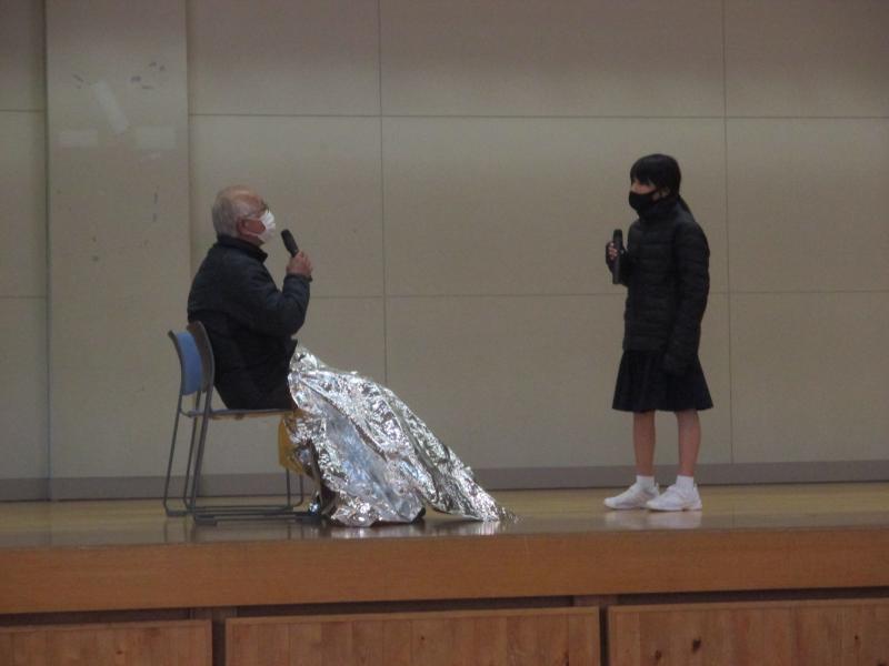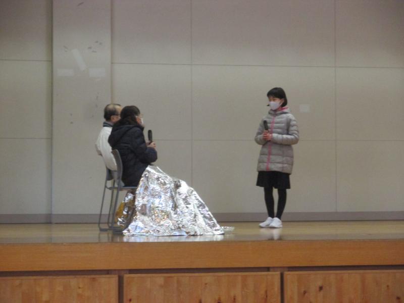 初めに、地震の様子や避難所生活について映像や写真で見ました。次に、簡単にできるフェイスシールドの作り方やアルミシートでの防寒の仕方を学びました。実際に避難所生活を体験した北村さんから、断水によってトイレ環境が悪化すること、赤ちゃんの泣き声によるトラブルがあることを教えてもらいました。子どもたちはまだ経験したことがない話で、真剣に聞いていました。