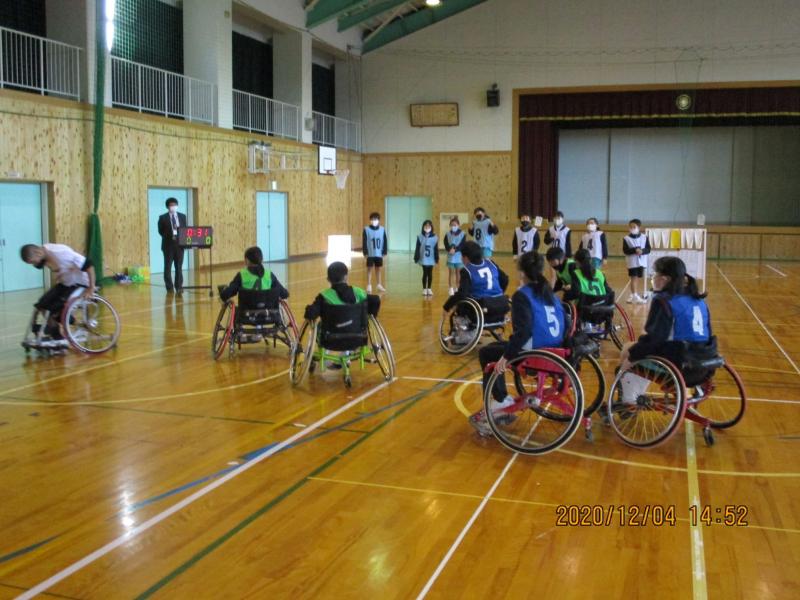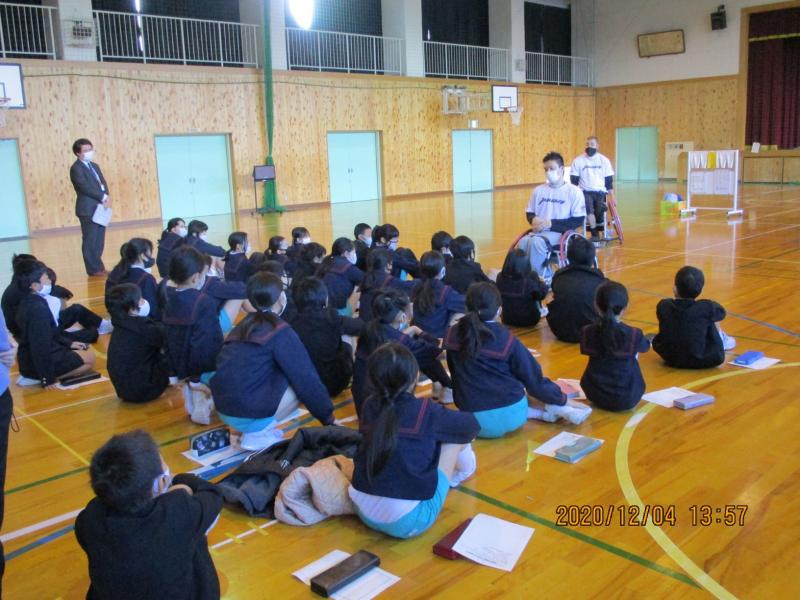 4年生の総合的な学習の時間「共に生きる」、6年生の「未来をデザインする~夢に向かって~」で、車椅子バスケットボールチーム『jamaney 石川』から、岩崎大輔さんと北野尚人さんをお招きして、車椅子での生活についての講話をしていただき、さらに車椅子バスケットボール体験をさせていただきました。