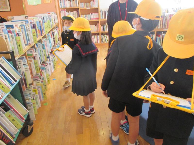 図書館では、グループごとに自由に見て回り、自分たちで見つけた図書館の工夫をメモしました。また、書庫も案内してもらい、多くの本があることに驚きを感じました。