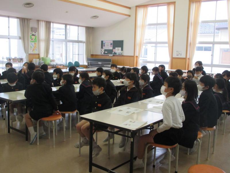 学校長は,まず冬休みを終え,子供たちが登校したことで学校の建物も雰囲気も温かくなったことを話し,学校はみんな(子供たち)のためのものであることを伝えました。次に,丑年にちなみ,牛さんがいろいろな面で私達人間の生活を支えてくれていることから,私達も考えて人のために行動することが大切であることや,それが「自立と『合い』」につながることを話しました。